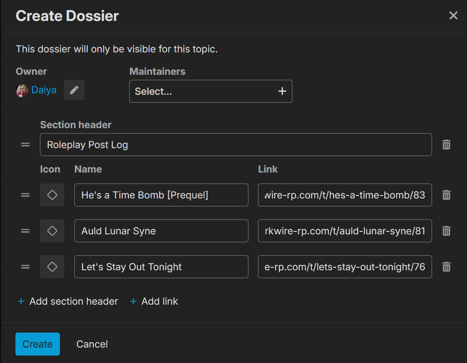 Both of these have just been for you and you alone. But what if you want to show everyone else a set of links, like all the topics you’ve written in to roleplay? For that, we have the Dossiers, available on your character bio topic.